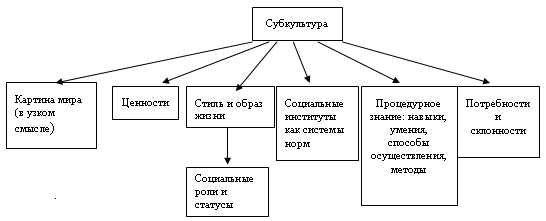 Поэтому, по нашему мнению, составляющими субкультуры и одновременно признаками ее оказываются: знание (картина мира в узком смысле); ценности; стиль и образ жизни; социальные институты как системы норм; процедурное знание (навыки, умения, способы осуществления, методы); потребности и склонности (см. схему)[15] .