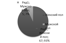 В опросе участвовало 72 преподавателя. 67 из них – женщины, 5 – мужчины, следовательно, делаем вывод, что большинство учителей в школе – женщины.