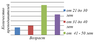 Самая большая возрастная группа – учителя от 41-50 лет – 32 человека. От 51 года и более – 22 преподавателя. От 31 до 40 лет – 10 человек, и меньше всего молодых преподавателей – от 21 до 30 лет.