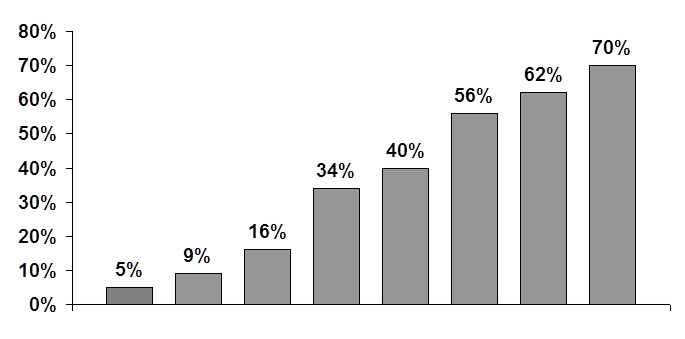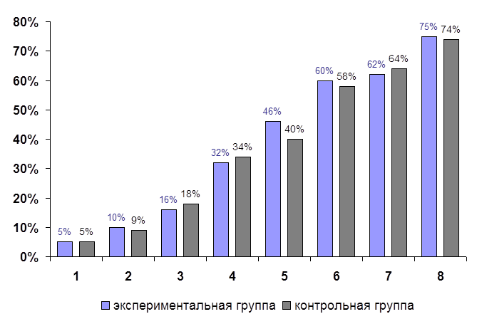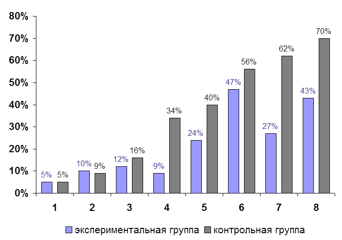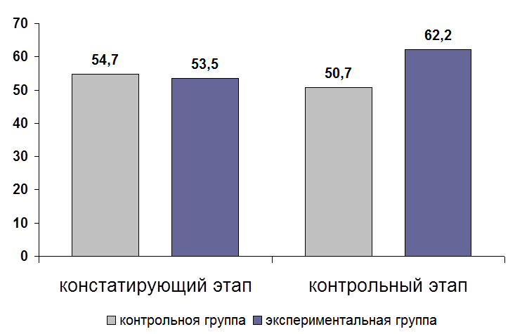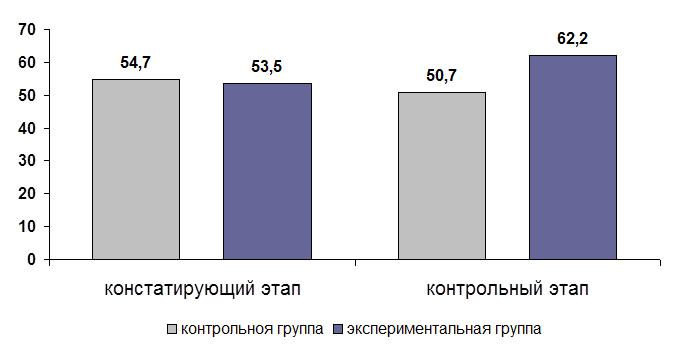 Уровневый и количественный анализ продуктивности психической деятельности детей с церебральным параличом, показывает качественные изменения процессов пространственного анализа и синтеза, развитие которых достоверно выше у детей экспериментальной группы, чем те же показатели у детей контрольной группы. Общий коэффициент продуктивности выполнения тестовых проб для экспериментальной группы составил: К пр.= 62,2; в контрольной группе: К пр.= 50,7.