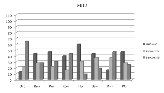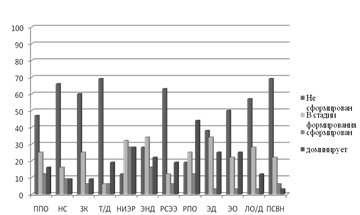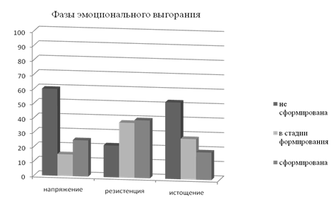 Так, у 40% испытуемых полностью сформирована фаза резистенции, у 38% она находится в стадии формирования, и не сформирована только у 22%. Фаза напряжения не сформирована у 60% испытуемых, находится в стадии формирования у 15% и сформировалась у 25%. Фаза истощения не сформирована у 53% испытуемых, находится в стадии формирования у 28% и сформирована у 19%.