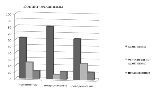 У подавляющего числа испытуемых копинг-механизмы адаптивные (эмоциональные – 81%, когнитивные и поведенческие по 63%). Это свидетельствует о том, что осознанный выбор стратегии поведения испытуемых склоняется в сторону конструктивных.