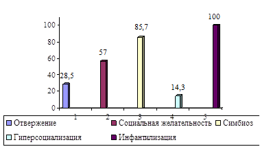 У 87,5% детей родители ощущают себя с ребенком единым целым, стремятся удовлетворить все потребности ребенка, оградить его от трудностей и неприятностей жизни Родитель постоянно ощущает тревогу за ребенка, ребенок ему кажется маленьким и беззащитным. Тревога родителей повышается, когда ребенок начинает автономизироваться в силу обстоятельств, так как по своей воле родитель не предоставляет ребенку самостоятельности никогда