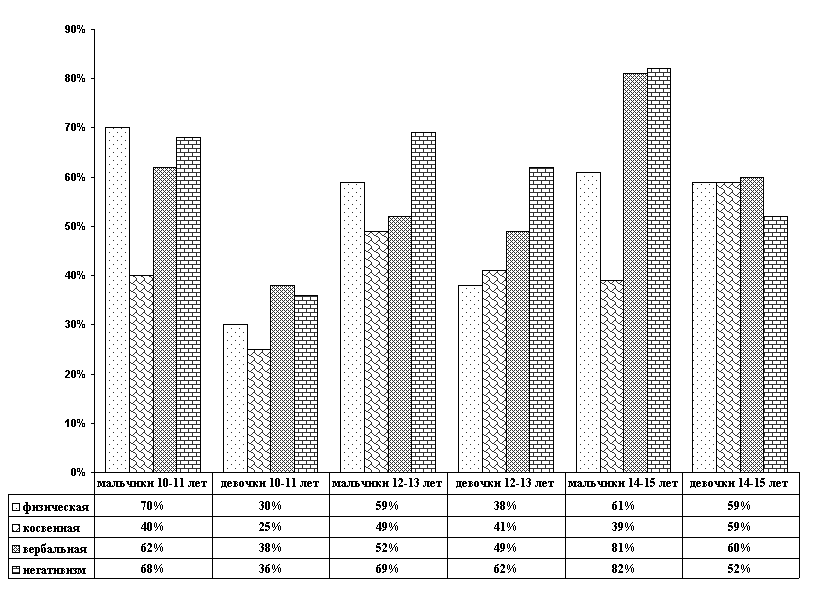 Анализ приведённых в таблице данных (приложения 11-15) показывает, что наибольшей агрессивностью отличаются 10-11-летние подростки-мальчики, у которых преобладает физическая агрессия. У мальчиков с возрастом происходит затухание физической агрессии, а у девочек наблюдается рост этой формы агрессивности. При спаде косвенной агрессии у мальчиков, идёт значительное увеличение её у девочек. В 12-13 лет отмечается снижение вербальной агрессии у мальчиков, при постоянном нарастании этой агрессии у девочек. К 14-15 годам у мальчиков так же происходит всплеск вербальной агрессии. Негативизм значительно сильнее проявляется у мальчиков на всех возрастных периодах подросткового возраста. У девочек негативизм несколько затухает при переходе с 13 к 14-15 годам. На основании анализа приведённых данных проистекает необходимость более детального изучения агрессивности девочек. За внешней грубостью мальчиков-подростков и скрытностью девочек лежит сложная картина половозрастных различий их развития, в том числе развития и проявления различных форм агрессивности.