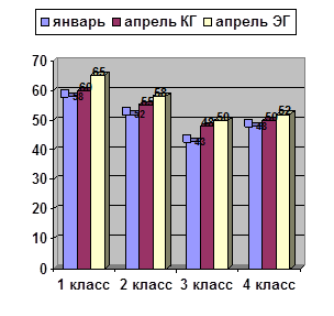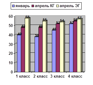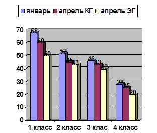 В ходе исследования было установлено, что дети младшего школьного возраста контрольной группы уступают своим сверстникам из экспериментальной группы в уровне развития эмоционально-личностной сферы. Анализируя данные, которые мы получили в результате обследования детей в январе и в апреле, можно проследить положительную динамику полученных данных. Сравнив показатели детей контрольных и экспериментальных классов мы можем сделать вывод, что применяемая нами методика, создает более благоприятную обстановку для развития творческой индивидуальности детей младшего школьного возраста. Причем следует обратить внимание на то, что таких результатов мы добились всего за 4 месяца.