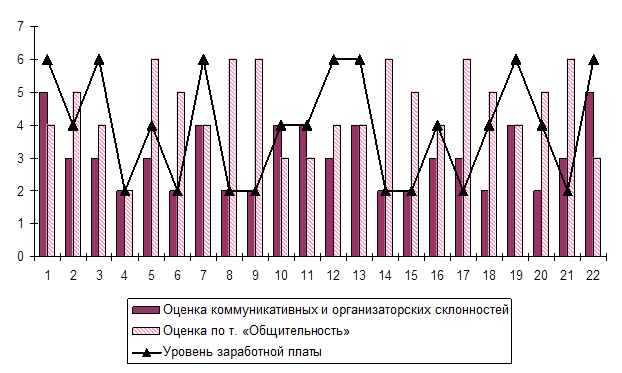 Очень четко прослеживается зависимость результата труда (заработная плата) от уровня коммуникативных и организаторских склонностей: при высоком и среднем уровне последних высокий заработок, при низком – он заметно уменьшается. Это наглядно видно на диаграмме, отражающей полученные нами показателей по каждому человеку.
