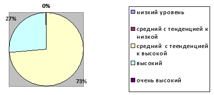 У 73% беременных женщин встречается средний уровень с тенденцией к высокой тревожности, что говорит о склонности беременной переживать тревогу, т.е. эмоциональное состояние, возникающее в ситуациях неопределенной опасности и проявляющееся в ожидании неблагополучного развития событий.