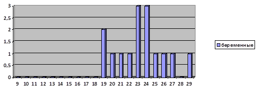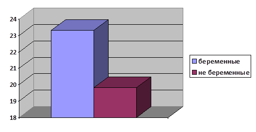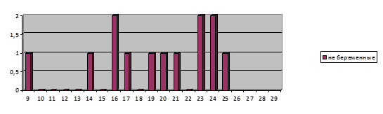 По результатам диаграммы 4 наблюдается разброс результатов изучения тревожности у не беременных женщин, от 9 – 25 баллов, что соответствует среднему уровню тревожности (с тенденцией к повышенной / пониженной).