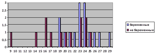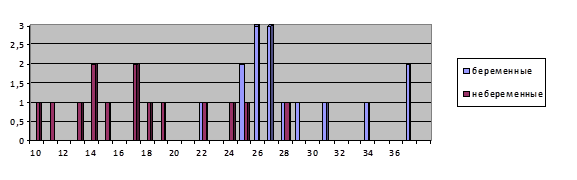 Диаграмма 11. Результаты исследования уровня тревожности у беременных и не беременных женщин (по вертикали – количество испытуемых, набравших определенный балл, по горизонтали – количество баллов)