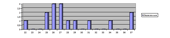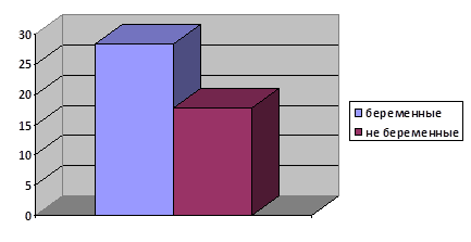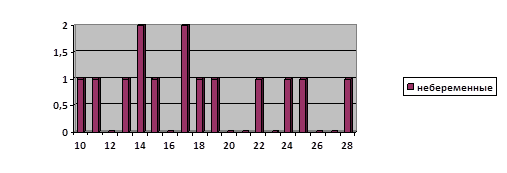 При рассмотрении диаграммы 10 можно увидеть разброс результатов изучения нервно-психической устойчивости у не беременных женщин, который наблюдается от 10 – 28 баллов, что говорит о хорошей и удовлетворительной нервно-психической устойчивости, в основном преобладают результаты 14-17 баллов, что соответствует удовлетворительной нервно – психической устойчивости.