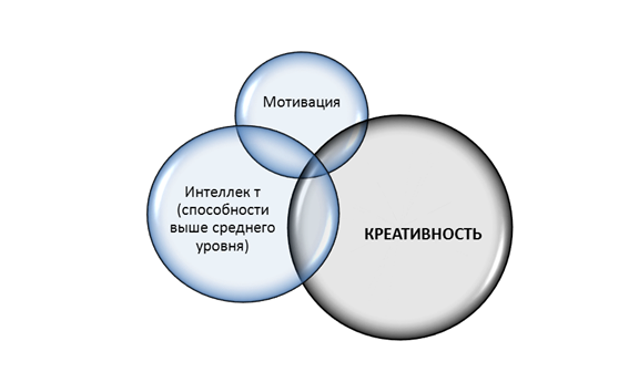 К числу наиболее популярных в современной психологии моделей одаренности относится концепция, разработанная американским ученым Джозефом Рензулли. Согласно этой концепции одаренность есть не просто высокий коэффициент интеллекта, или высокая креативность, это сочетание трех основных характеристик: интеллектуальных способностей (превышающих средний уровень), креативности и настойчивости (мотивация, ориентированная на задачу). Суть ее хорошо иллюстрирует предложенная автором схема.