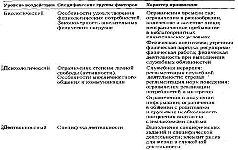 Как следует из данной таблицы, существует целый перечень факторов, оказывающих специфическое воздействие на военнослужащих. При этом данное воздействие в зависимости от особенностей того или иного фактора может осуществляться на одном из трех уровней: биологическом, психическом и деятельностном. Проведенные исследования позволяют говорить о том, что военно-профессиональная деятельность существенно отличается от других видов социальной деятельности. Данные отличия обусловливают необходимость адаптации человека к новым условиям при поступлении его на военную службу.
