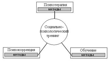 Многие авторы вводят понятие социально-психологического тренинга как совокупность методов. Однако, определяя границы понятия СПТ, И. Вачков пишет: «Современное понимание тренинга включает в себя многие традиционные методы групповой психотерапии и психокоррекции, что вынуждает искать его истоки в разнообразных направлениях клинической психотерапии в группах» [16, 7]. Действительно, рассматривая СПТ в рамках деятельности по развитию личности, мы сталкиваемся с разнообразными методами групповой психологической работы, граничащими с обучением, терапией и коррекцией.