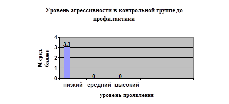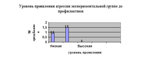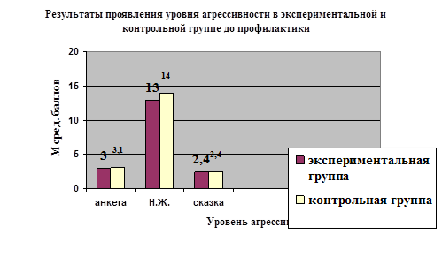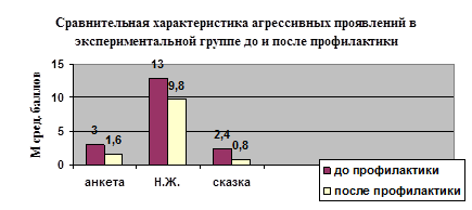 4. Профилактическая работа, проведенная в экспериментальной группе, была результативна и эффективна, что доказал формирующий эксперимент: уровень агрессии снизился с помощью таких методов и методических приемов и упражнений как «Рисование», «Лепка», «Я злюсь…», «Психогимнастика», «Этюды».