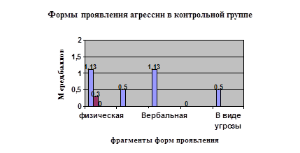 2. Среди различных форм проявления агрессии у детей с нарушениями опорно-двигательного аппарата преобладают также формы, как вербальная и физическая агрессия, так и в меньшей степени скрытая. Вербальная агрессия у таких детей проявляется в виде произнесения обидных слов, нецензурных слов. Физическая агрессия, направленная на других отсутствует, а существует агрессия, направленная на себя и на предметы. Это мы объясняем тем, что в этом возрасте у детей еще не сформированы навыки рефлексии и самосознания.