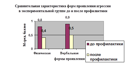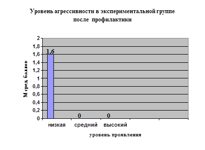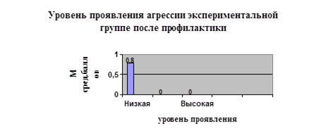 4.После профилактической работы была проведена повторная оценка уровня агрессии по тем же методикам и в тех же условиях. Было выявлено, что показатели агрессии в экспериментальной группе снизились после профилактической работы.