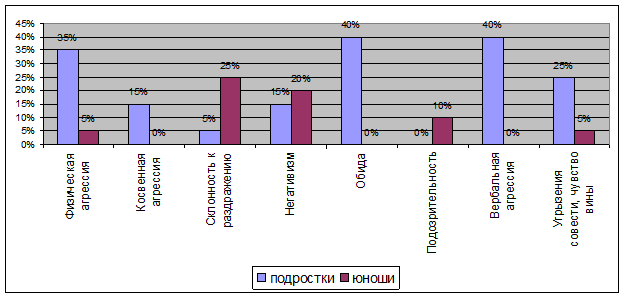 В ходе исследования было установлено, что у подростков наиболее выражены физическая и вербальная агрессия и обидчивость, а юноши более склоны к раздражению. В целом у большинства подростков и юношей высокий уровень враждебности. Высокая враждебность у подростков и юношей мы объяснили отсутствием уверенности в себе и нестабильной самооценкой, а также подозрительностью и ощущением предвзятого к себе отношения.