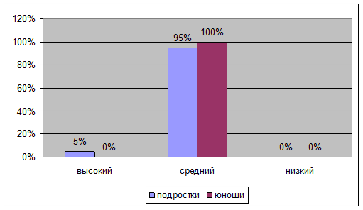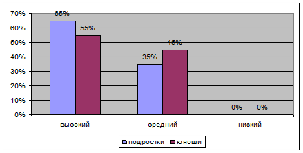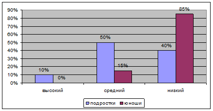 3. Среди подростков 10% имеют высокий уровень, половина средний и 40% - низкий. Среди юношей большинство не склонны к агрессий и лишь у 15% низкий уровень агрессивности.