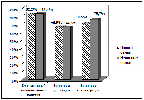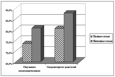 Родители из неполных семей показали высокую степень ощущения самопожертвования и сверхавторитет родителей, а также чрезмерное вмешательство в мир ребенка. В полных семьях на первое место ставится уравнение отношений между родителями и ребенком, в неполных семьях этот показатель несколько ниже. В обеих группах семей низкие показатели по признаку уклонения от конфликта.