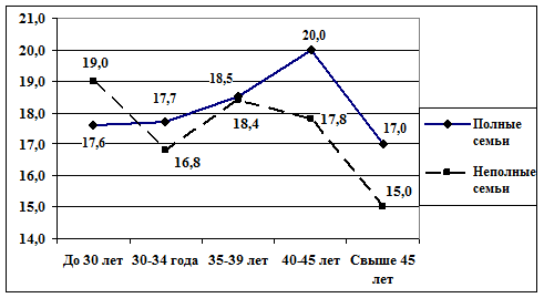 В меньшей степени уравнивают отношения между собой и ребенком родители: в полных семьях – старше 45 лет (17) и в неполных – также старше 45 лет, но показатель несколько ниже (15). В целом, в полных семьях наблюдается повышение показателей у родителей до 30 – 45 лет, затем резкое снижение у родителей старше 45 лет. В неполных семьях показатель постоянно меняется: то повышается, то снижается на 1-2,5 балла.