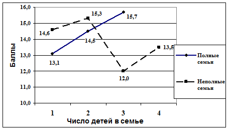В полных семьях наблюдается стабильное повышение чрезмерной заботы с увеличением количества детей в семье (13,1 – 15,7). В неполных семьях – постоянное изменение этого признака: более высоки показатели в семьях с 2 детьми (15,3), более низкие – в семьях, где воспитывается 3 детей (12).
