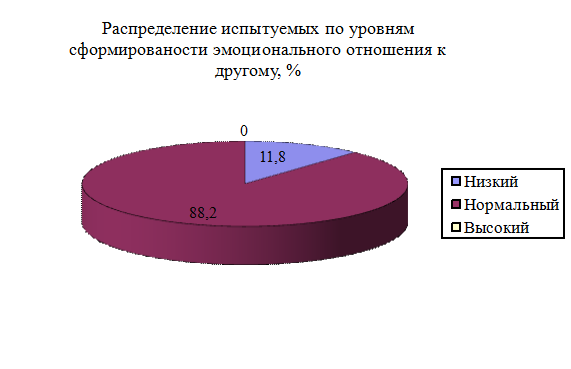Количественный анализ полученных данных свидетельствуют о том, что у испытуемых преобладает нормальный уровень эмпатийности (15 человек - 88,2%).