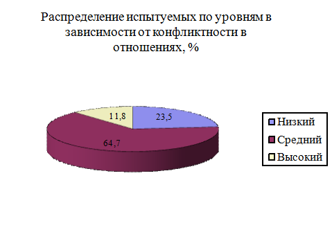 Количественный анализ полученных данных свидетельствуют о том, что у испытуемых преобладают средние значения конфликтности в отношениях – 11 человек(64,7%)