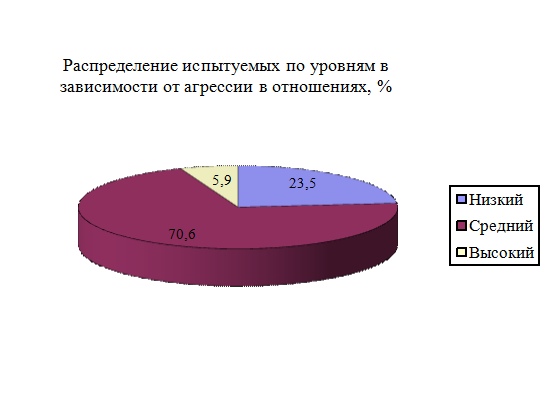 Количественный анализ полученных данных свидетельствуют о том, что у испытуемых преобладают средние значения агрессии в отношениях – 12 человек(70,6%).