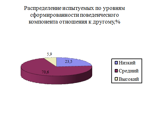 Анализ данных исследования поведенческого компонента отношений к другому в юношеском возрасте позволил выделить три уровня в зависимости от таких характеристик, как напряженность, отчужденность, конфликтность и агрессия в отношениях. Высокие значения - 1 человек (5,9%)— наличие дисгармонии в межличностных отношениях. Это отсутствие единства, согласия с другими людьми, ослабление позитивных эмоциональных связей, преобладание удаляющих чувств (одиночество, неприязнь, злость, вина, раскаяние, зависть, стыд, обида) над сближающими чувствами. Средние значения - 12 человек(70,6%) — отношения достаточно гармоничные. Отношения носят стабильный характер, предполагающий длительное сохранение взаимодействия в паре (группе), вызывающее положительные чувства, эмоциональный комфорт у партнеров (или в группе). Имеется стремление учитывать индивидуальные особенности друг друга. Отношения носят открытый, естественный характер. Низкие значения - 4 человека (23,5%) — возможно, чрезмерно выражены сближающие чувства, такие как единство, общность между людьми, дружелюбие, добросердечие, признательность, уважение, любовь, что также говорит о дисгармонии в отношениях. Низкие значения могут свидетельствовать либо о том, что человек не замечает наличия трудностей, проблем в отношениях (не желает признавать их), либо о неискренности в ответах.
