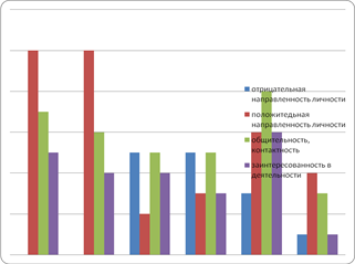 По результатам исследования, нами установлено, что отрицательная направленность личности встречается у 67% испытуемых, положительная направленность личности встречается у всех испытуемых, т.е. 100%, общительность, контактность так же присуще 100% детей, заинтересованность в данной деятельности отмечена у 100% испытуемых детей. Но процентное соотношение по всем перечисленным критериям у всех испытуемых детей различно и индивидуально.