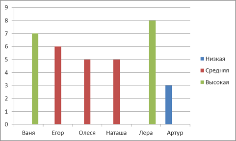 Следующий критерий по которому были оценены испытуемые- заинтересованность в предложенной деятельности. Все дети были заинтересованы и увлечены игрой «Собирание мозаики». Лера получила 6 баллов, Ваня 5 баллов и Егор 4 балла, Олеся 4 балла у этих испытуемых отмечены высшие баллы, Наташа получила 3 балла, Артур 1 балл. Все испытуемые были заинтересованы в предложенной деятельности, они строили сами или вместе с партнером, т.е. активно выполняли задание, давали советы и реплики по поводу работы, следили за работой партнера.