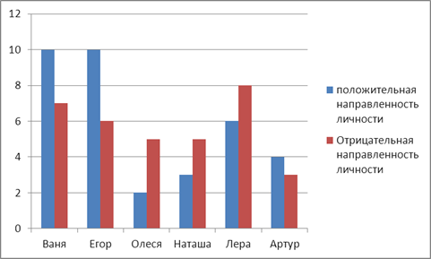 Отрицательная направленность Леры составила 3 балла и Артура 1 балл. Этим испытуемые забирали фигурки друг у друга, на забирание фигурок реагировали негативно. Только по этим критериям у Леры и Артура была выделена отрицательная направленность личности, это поведение у них было отмечено в начале их совместной деятельности, затем испытуемые работали коллективно, всячески помогая друг другу.