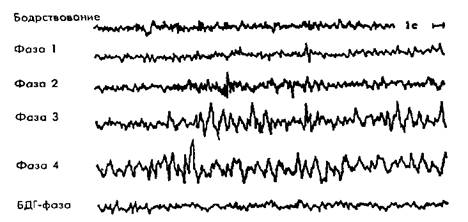 Медленный сон подразделяется на несколько стадий, выделенных на основании изменений ЭЭГ (рис. 2.1) и отличающихся по глубине. В первой стадии исчезает основной биоэлектрический ритм бодрствования — альфа-ритм. Он сменяется низкоамплитудными колебаниями различной частоты. Это стадия дремоты, засыпания. При этом у человека могут возникать сноподобные галлюцинации. Вторая стадия (поверхностный сон) характеризуется регулярным появлением веретенообразного ритма 14—18 колебаний в секунду («сонные» веретена). С появлением первых же веретен происходит отключение сознания; в паузы между веретенами человека легко разбудить. Третья и четвертая стадии объединяются под названием дельта-сна, потому что во время этих стадий на ЭЭГ появляются высокоамплитудные медленные волны — дельта-волны. В третьей стадии они занимают от 30 до 50% всей ЭЭГ. В четвертой стадии дельта-волны занимают более 50% всей ЭЭГ. Это наиболее глубокая стадия сна, здесь наивысший порог пробуждения, самое сильное отключение от внешнего мира. При пробуждении в этой стадии человек с трудом ориентируется, в наибольшей степени компрессирует время (недооценивает длительность предшествующего сна). Дельта-сон преобладает в первую половину ночи. При этом снижается мышечный тонус, становятся регулярными и урежаются дыхание и пульс, понижается температура тела (в среднем на 0,5о ), отсутствуют движения глаз, может регистрироваться спонтанная кожно-гальваническая реакция.