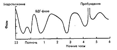 Рис. 2.1. Фазы сна. ЭЭГ при различных фазах сна (вверху). Изменения глубины сна на протяженииночи, удлинение периодов БДГ–сна(внизу).