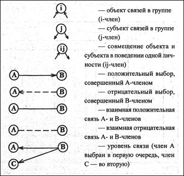 Социограмма - схематическое изображение реакции испытуемых друг на друга при ответах на социометрический критерий. Социограмма позволяет произвести сравнительный анализ структуры взаимоотношений в группе в пространстве на некоторой плоскости ("щите") с помощью специальных знаков (См. Рисунок 2).