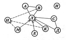 Социограммная техника является существенным дополнением к табличному подходу в анализе социометрического материала, ибо она дает возможность более глубокого качественного описания и наглядного представления групповых явлений. Анализ социограммы начинается с отыскания центральных, наиболее влиятельных членов, затем взаимных пар и группировок. Группировки составляются из взаимосвязанных лиц, стремящихся выбирать друг друга. Наиболее часто в социометрических измерениях встречаются положительные группировки из 2-3 членов, реже из 4 и более членов (См. рис.3)
