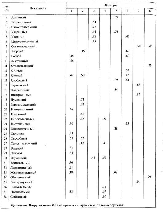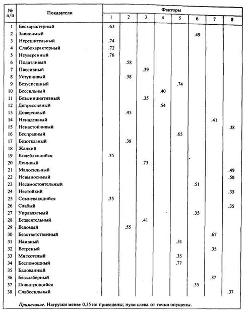Полученные результаты были подвергнуты факторному анализу с последующим варимакс-вращснием. Для черт безвольного слабого человека было выбрано восьмифакторное решение. Результаты факторного анализа приведены в табл.1.