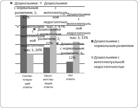- ответы детей с интеллектуальной недостаточностью младшего и старшего школьного возраста на большинство рисунков схожи, и при этом значительно отличаются от ответов дошкольников с интеллектуальной недостаточностью (рисунок 2);