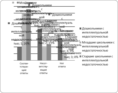 Проводя качественный анализ полученных данных, нами отмечено, что, во-первых – в младшем школьном возрасте у детей с интеллектуальной недостаточностью сокращается число несоответствующих ответов по методике по сравнению с дошкольным возрастом, это связано с тем, что дети начинают осознавать и понимать изображенные на картинках ситуации межличностных отношений. У детей с интеллектуальной недостаточностью старшего школьного возраста количество несоответствующих ответов минимально (24%), дети хорошо ориентируются в изображенной ситуации, пытаются придумать сюжет, уточняют имена героев. Это также можно связать с тем, что у детей повышается возможность к социализации, а также сказывается работа психолого-педагогического коррекционного воспитания.