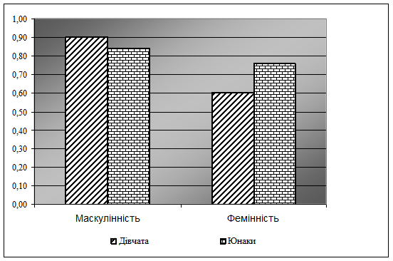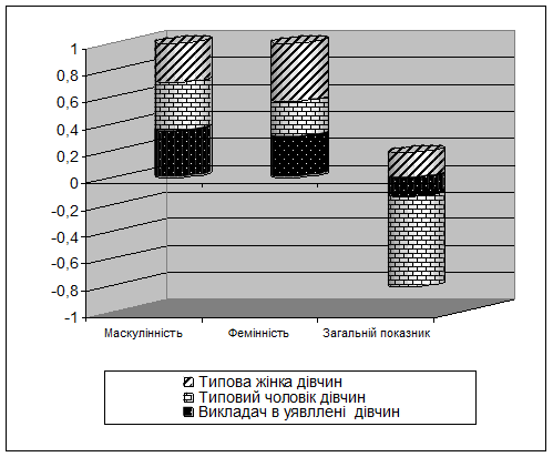 Образ ідеального викладача у юнаків наділений вираженими феміннимі і маскуліннимі рисами. Уявлення про викладачів у дівчат скоріше можна співвіднести з образом чоловіка, оскільки вони наділяють даний образ досить високим рівнем маскулінності і середнім рівнем фемінності, що можливо також пов'язано із стереотипним сприйняттям жінок як менш схильних до аналітико-синтетичної діяльності, яка є невід'ємною частиною діяльності педагога (дивитись додаток А).