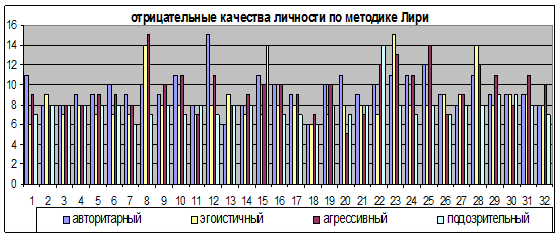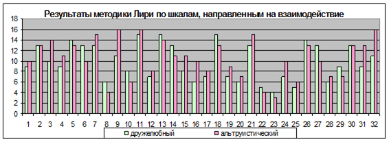 3. методика межличностных отношений Лири показала, что большинству исследуемых свойственна агрессивность и дружелюбие, примерно, в равной степени, а нарушение этого дисбаланса приводит к повышенной агрессивности или дружелюбию, влияющих на межличностные отношения. Так, в нашем случае, только 21% склонны к агрессивности и эгоизму, влияющие отрицательно на межличностное взаимодействие, а 38% исследуемых обладают высокой степенью дружелюбия и альтруизма, направленных на взаимодействие, и что подтверждает благоприятный уровень межличностного взаимодействия в данном коллективе.