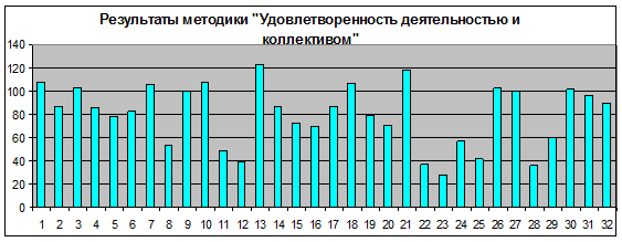 Таким образом, методика – «Удовлетворенности коллективом и деятельностью» показала, что (37,5%) исследуемых имеют высокий уровень удовлетворенности, это (исследуемые под №13,21, 10, 1, которые согласно социометрии, являются лидерами в данном коллективе), а также исследуемые под №18, 7,3, 30, 26, 27, 9, 31, которые, согласно результатам социометрии в данном коллективе являются предпочитаемыми.