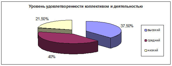 4. методика «Удовлетворенности коллективом и деятельностью» показала, что 37,5% исследуемых имеют высокий уровень удовлетворенности: это исследуемые под №13, 21, 10, 1, которые согласно социометрии, являются лидерами в данном коллективе, и исследуемые под №18, 7,3, 30, 26, 27, 9, 31, которые, согласно результатам социометрии, в данном коллективе являются «предпочитаемыми». И только 7 человек (21,5%) – имеют низкий уровень удовлетворенности, среди которых исследуемые, согласно результатам социометрии, относятся к числу «принебрегаемых». Остальные исследуемые (40%), имеют средний уровень удовлетворенности, которые в большей степени удовлетворены, как организацией трудовой деятельности, так и коллективом.