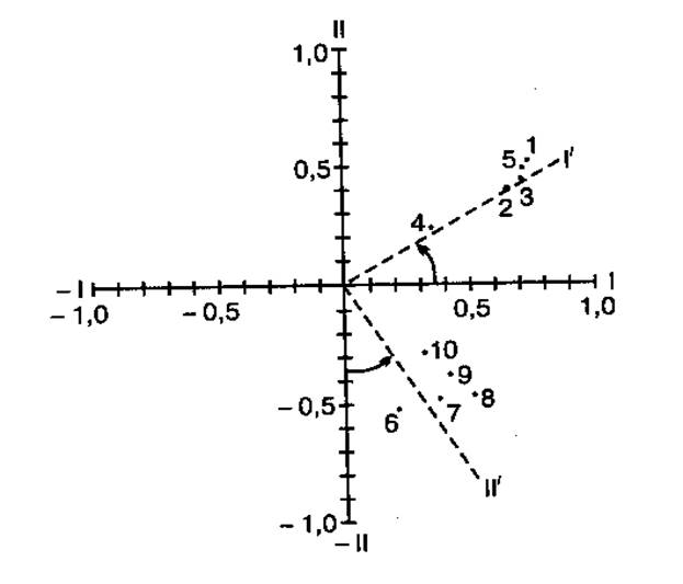 Оси координат. Принято представлять факторы геометрически в виде осей координат, относительно которых каждый тест может быть изображен в виде точки. Рис. 1 поясняет эту процедуру. На этом графике каждый из 10 тестов, приведенных в табл.1, отображен в виде точки относительно двух факторов, которые соответствуют осям I и II. Так, тест 1 представлен точкой с координатами 0,74 по оси I и 0,54 по оси II. Точки, представляющие остальные 9 тестов, построены аналогичным способом, с использованием значений весов из табл. 1.