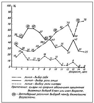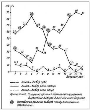 Выбор мальчиками роли матери незначителен. Относительно чаще (различия недостоверны) они выбирают эту роль в 4 года; в 14—15 лет подобный выбор полностью отсутствует. Между выбором ролей матери и отца во всех возрастах, кроме 10 лет, есть статистически достоверные различия, что подтверждает преимущественно однополый характер идентификации детей с родителями.