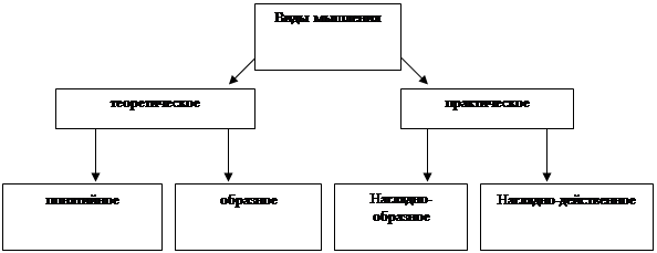 Мышление делится на виды: теоретическое понятийное, теоретическое образное, наглядно-образное, наглядно-действенное. Перечисленные виды мышления выступают одновременно и как уровни его развития. Теоретическое мышление считается более совершенным, чем практическое, а понятийное представляет собой более высокий уровень развития, чем образное.