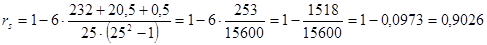 В данном случае, в ряду А присутствует 4 группы одинаковых рангов, следовательно а1 = 3, а2 =2, а3 =6, а4 =2.