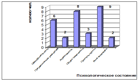 7. Общая тревожность. Проявляется на физиологическом уровне (ломота в спине, спазмы желудка, головные боли), в психической сфере (постоянное беспокойство и озабоченность, «параноидальные» явления — например, необоснованная боязнь преследования), в эмоциональных переживаниях (постоянное чувство страха, неуверенность в себе, комплекс вины).