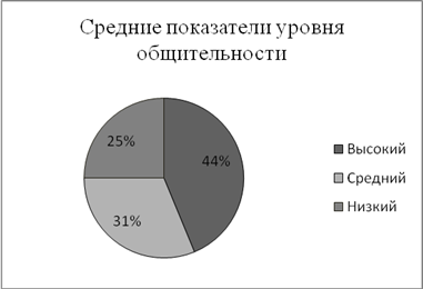 Проведенное эмпирическое исследование на выявление уровня общительности дало следующие результаты: 44% подростков обладают высокой степенью уровня общительности. Это говорит о том, что данный человек весьма общительный, разговорчивый, охотно знакомиться с новыми людьми, любят быть в центре внимания. 31% обладают средней коммуникабельностью, в общении с другими достаточно терпеливы, с новыми людьми сходится с оглядкой, в спорах и диспутах участвуют неохотно, свою точку зрения отстаивают без вспыльчивости. 25% подростков замкнуты, неразговорчивы, предпочитают одиночество, поэтому у них мало друзей.