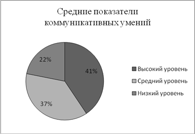 Анализ средних показателей коммуникативных умений показывают следующее: 41% подростков обладают высоким уровнем коммуникативных умений, то есть у таких людей в большей степени развито умение слышать, могут входить в положение другого. 37% обладают средним уровнем коммуникативных умений. Для таких людей беседа не главный источник, от них многое можно узнать, но не только они обладают истиной, даже критику и упреки им полезно выслушать. 22% подростков обладают низким уровнем коммуникативных умений.